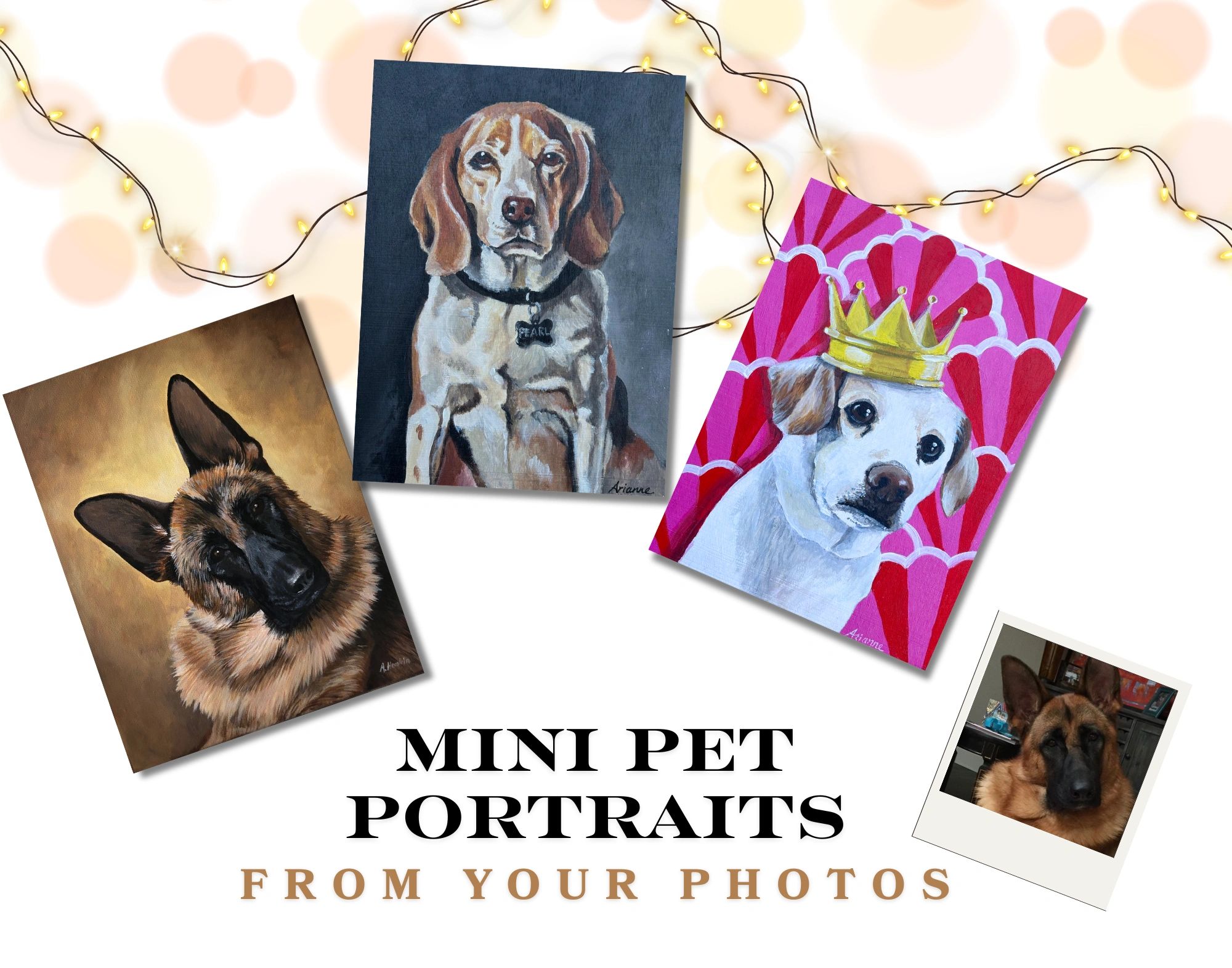Created using your emailed images for reference, these hand-painted mini-masterpieces on 6”x8” cradled wood canvas make perfect one-of-a-kind holiday gifts. $95 plus shipping
